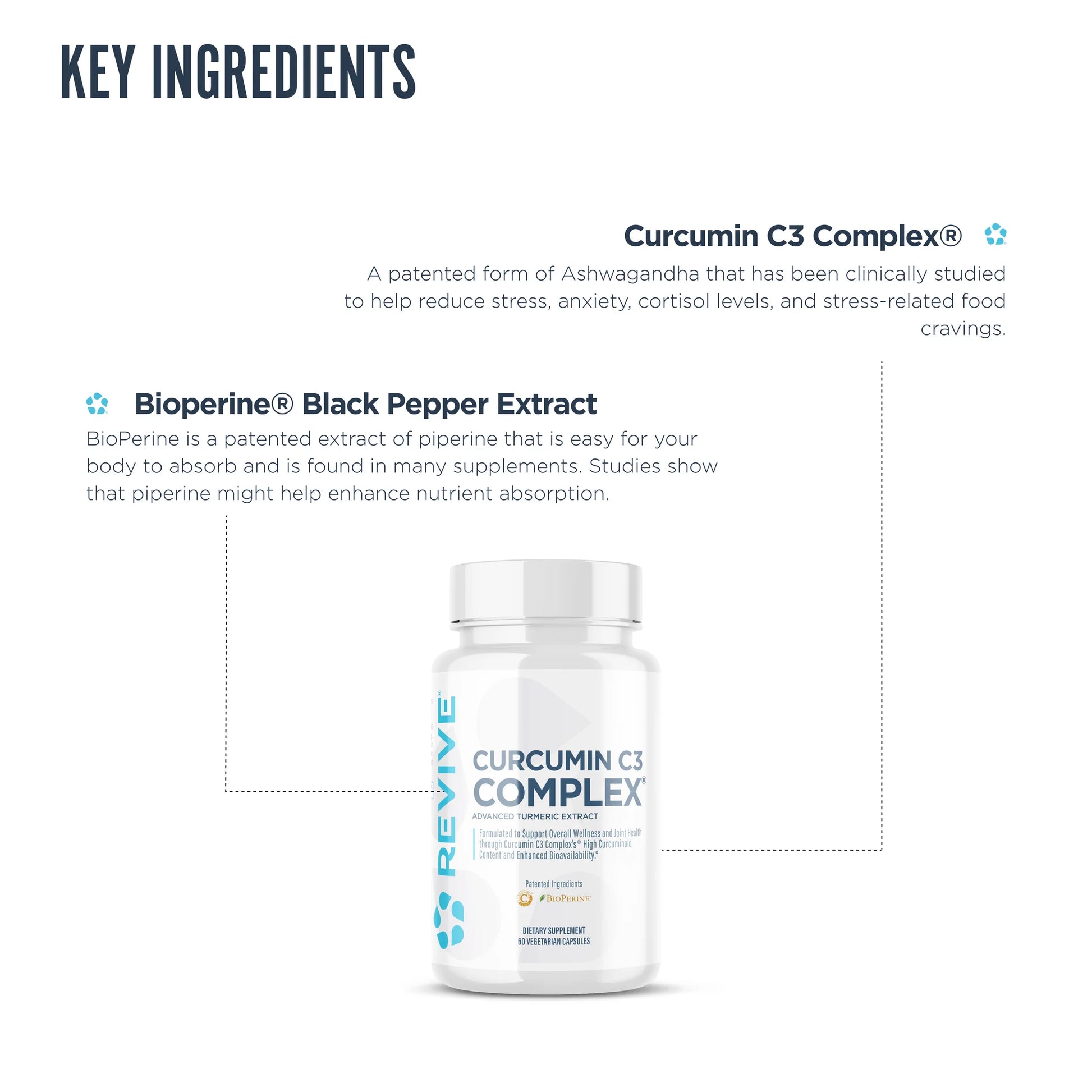 Revive Curcumin C3 Complex® es una forma patentada y clínicamente estudiada de curcumina, el compuesto activo presente en la cúrcuma. Contiene tres curcuminoides principales: curcumina, demetoxicurcumina y bisdemetoxicurcumina, estandarizados al 95 % de curcuminoides. Esta composición específica está diseñada para maximizar los beneficios para la salud asociados con la curcumina.*